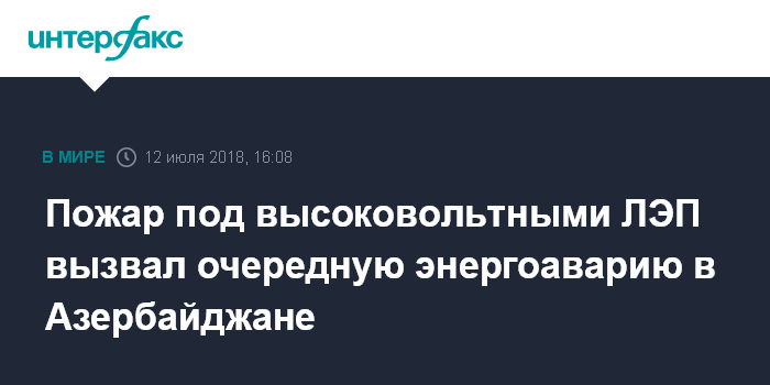 Москва. 12 июля. INTERFAX.RU - Пожар под высоковольтными ЛЭП на территории Агсуинского района Азербайджана привел к ограничениям в энергоснабжении в Баку и ряда регионов страны, сообщил агентству "Интерфакс" глава пресс-службы АО "Азерэнержи" Яхья Бабанлы.