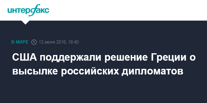 Москва. 12 июля. INTERFAX.RU - США считают правильным решение Греции выслать двух российских дипломатов и запретить въезд на территорию государства еще двум, написала в четверг в твиттере представитель американского госдепартамента Хизер Нойерт.