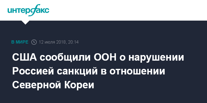 Москва. 12 июля. INTERFAX.RU - Администрация президента США Дональда Трампа на этой неделе потребовала от ООН предупредить Россию и Китай о наличии данных, согласно которым эти государства продавали нефтепродукты в Северную Корею в нарушение санкций в отношении Пхеньяна, пишет в четверг газета "Уолл-стрит джорнэл".
