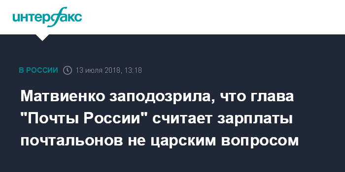 "Мы еще раз почитали эти справки: очень стыдно за руководителя "Почты", который вообще не владеет... Ну не царское дело, наверное, почтальонами заниматься, а это как путейщик на железных дорогах, так и почтальон - основная опорная фигура во всей системе почты", - сказала Матвиенко на заседании Совета Федерации.