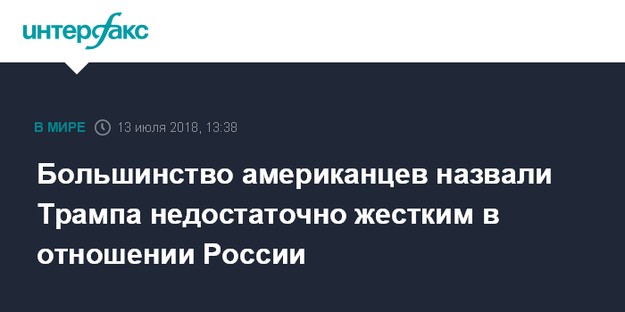 Москва. 13 июля. INTERFAX.RU - Чуть больше половины граждан США полагают, что американский лидер Дональд Трамп придерживается недостаточно жесткой позиции в отношении России, свидетельствуют результаты опроса телеканала Fox News.