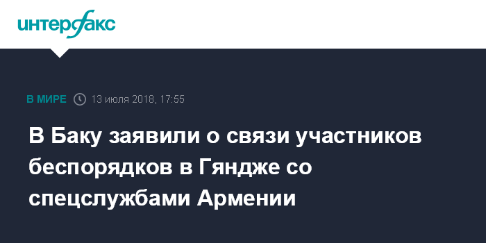 Москва. 13 июля. INTERFAX.RU - Правоохранительные органы Азербайджана считают, что некоторые участники беспорядков в городе Гяндже тесно связаны с радикальными религиозно-экстремистскими организациями, которые сотрудничают со спецслужбами Армении.