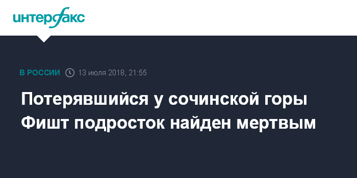 Москва. 13 июля. INTERFAX.RU - Подросток из Новосибирской области, пропавший 3 июля близ Сочи во время туристического похода в районе подножья горы Фишт, обнаружен мертвым.