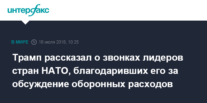 "Я получил множество звонков от лидеров государств-членов НАТО, которые поблагодарили меня за то, что я их собрал для обсуждения финансовых обязательств - на сегодняшний день и в перспективе", - написал Трамп в твиттере.