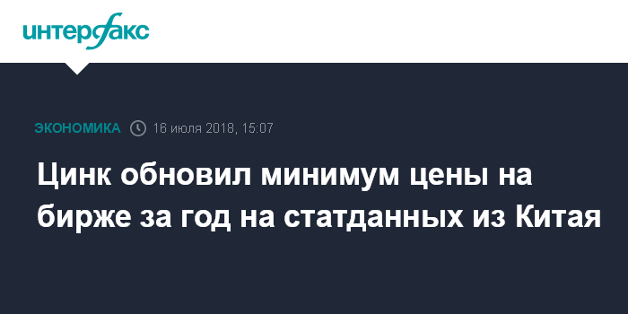 Москва. 16 июля. INTERFAX.RU - Стоимость цинка на Лондонской бирже упала до минимума за год на опасениях по поводу замедления темпов роста экономики Китая.