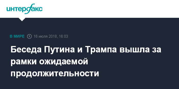 Москва. 16 июля. INTERFAX.RU - Президент РФ Владимир Путин и президент США Дональд Трамп общаются тет-а-тет дольше запланированного, подтверждая тезис о "безлимитном" характере нынешней встречи.