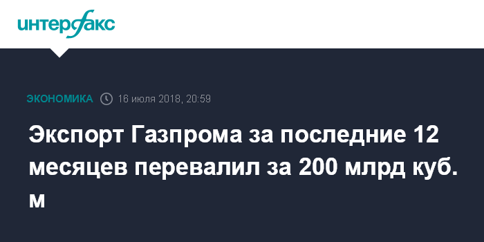 Москва. 16 июля. INTERFAX.RU - Экспорт газа "Газпрома" в дальнее зарубежье за последние 12 месяцев (с 16 июля 2017 года по 15 июля 2018 года) перевалил за 200 млрд кубических метров, свидетельствуют расчеты "Интерфакса" на основе оперативных данных "Газпрома".