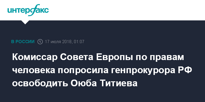 Москва. 17 июля. INTERFAX.RU - Комиссар Совета Европы по правам человека Дуня Миятович в открытом письме к генпрокурору России Юрию Чайке просит освободить из-под стражи руководителя чеченского "Мемориала" Оюба Титиева.