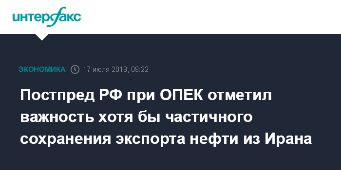 Москва. 17 июля. INTERFAX.RU - Даже частичное сохранение экспорта иранской нефти в условиях американских санкций окажет стабилизирующее воздействие на рынок нефти, заявил постпред РФ при ОПЕК и других международных организациях в Вене Михаил Ульянов.