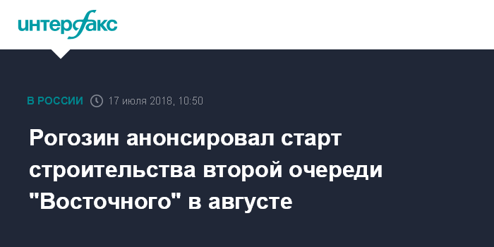 Москва. 17 июля. INTERFAX.RU - Работы по строительству второй очереди космодрома Восточный начнутся до конца лета, заявил журналистам глава "Роскосмоса" Дмитрий Рогозин.