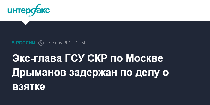 Москва. 17 июля. INTERFAX.RU - Бывший начальник Главного следственного управления СКР по Москве Александр Дрыманов задержан по делу о получении взятки высокопоставленными сотрудниками следствия, сообщил "Интерфаксу" информированный источник.