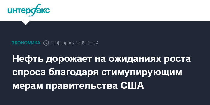 Москва. 10 февраля. INTERFAX.RU - Нефть дорожает на ожиданиях роста спроса на топливо благодаря стимулирующим мерам правительства США, содержащимся в "плане Обамы", который на этой неделе, как ожидается, будет утвержден Сенатом и Конгрессом США, сообщило агентство Bloomberg.