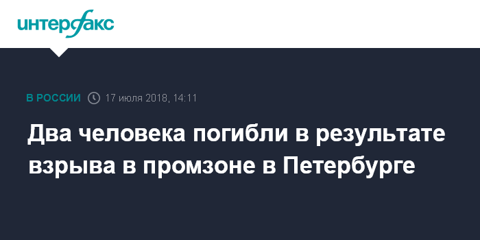 Москва. 17 июля. INTERFAX.RU - При взрыве газа в промзоне на севере Петербурга погибли двое рабочих, сообщили "Интерфаксу" в местном главке МВД.
