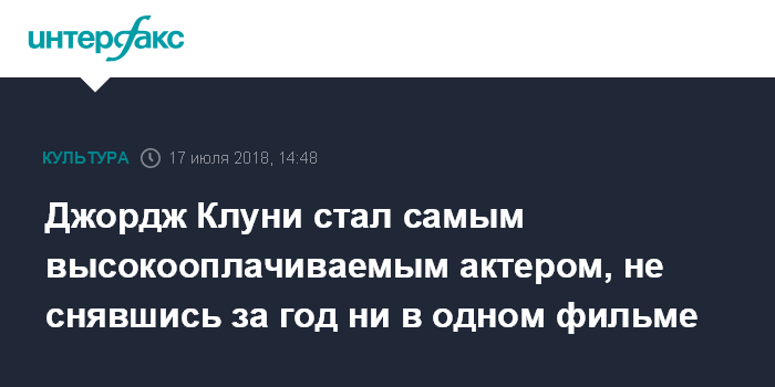 Москва. 17 июля. INTERFAX.RU - Американский актер, режиссер и продюсер Джордж Клуни заработал больше всех своих коллег за 12 месяцев (по июнь 2018 года) - $239 млн до вычета налогов, говорится в исследовании Forbes.