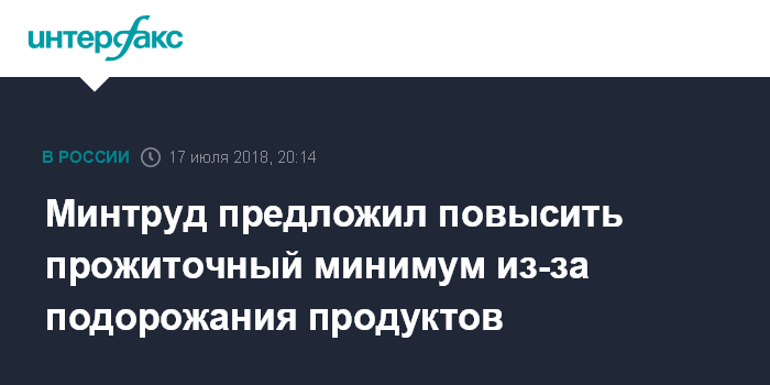 Москва. 17 июля. INTERFAX.RU - Минтруд России предлагает увеличить прожиточный минимум за второй квартал этого года на душу населения на 4% по сравнению с первым кварталом из-за роста цен на продукты в потребительской корзине.