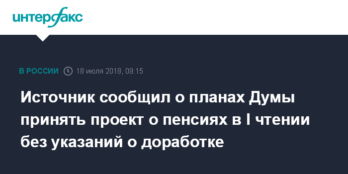 Москва. 18 июля. INTERFAX.RU - Госдума в четверг при голосовании в первом чтении за пенсионный законопроект не будет принимать специальное постановление с указанием норм, требующих изменения или доработки ко второму чтению, сообщил "Интерфаксу" в среду источник в руководстве палаты.