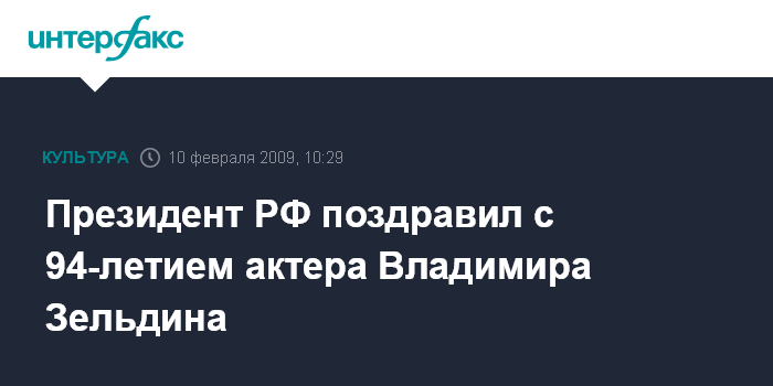 Москва. 10 февраля. INTERFAX.RU - Президент России Дмитрий Медведев поздравил артиста театра и кино, актера Центрального академического театра Российской Армии, народного артиста СССР Владимира Зельдина с 94-летием.