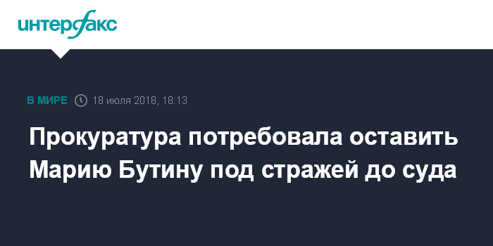 Москва. 18 июля. INTERFAX.RU - Федеральная прокуратура США попросила суд оставить россиянку Марию Бутину под стражей вплоть до начала судебного разбирательства по ее делу, сообщает в среду агентство Bloomberg.