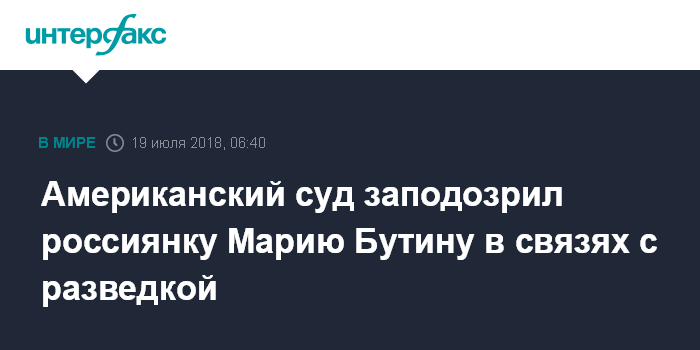 Москва. 19 июля. INTERFAX.RU - Сторона обвинения россиянки Марии Бутиной, арестованной в США по подозрению в "конспиративной деятельности" в пользу России, считает, что она может иметь связи с российскими разведывательными структурами. В качестве доказательства в ходе судебного заседания была предъявлена фотография Бутиной на обеде в ресторане с российским представителем, подозреваемым в принадлежности к разведслужбе. Этот россиянин покинул США в составе других 60 сотрудников российских дипмиссий, высланных на волне скандала с использованием отравляющего вещества в британском Солсбери.