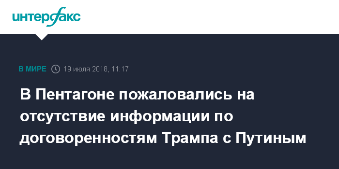 Москва. 19 июля. INTERFAX.RU - Даже у самых высокопоставленных сотрудников американского министерства обороны очень мало или совсем нет информации о том, каких договоренностей по национальной безопасности мог достигнуть президент США Дональд Трамп в ходе встречи тет-а-тет с президентом России Владимиром Путиным, пишет