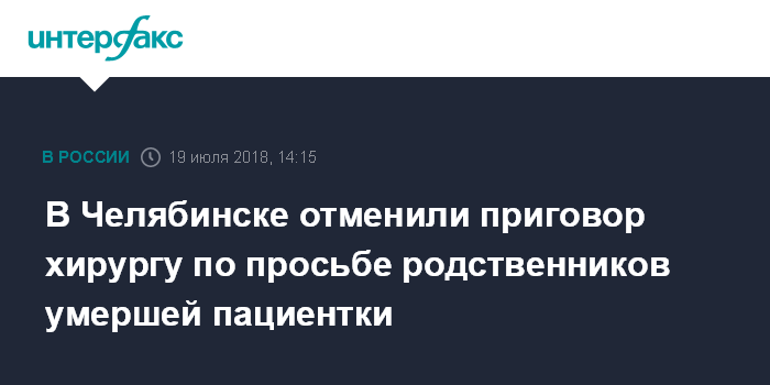 Москва. 19 июля. INTERFAX.RU - Челябинский областной суд отменил обвинительный приговор суда первой инстанции хирургу, который проколол оболочку сердца пациентки, что привело к ее смерти.