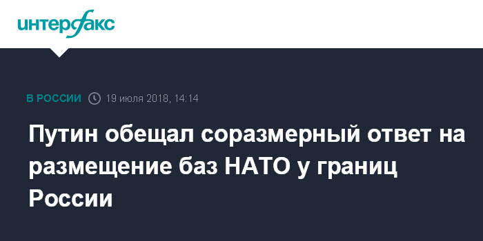 Москва. 19 июля. INTERFAX.RU - Россия соразмерно ответит на размещение военных баз НАТО у российских границ, заявил в четверг президент РФ Владимир Путин.