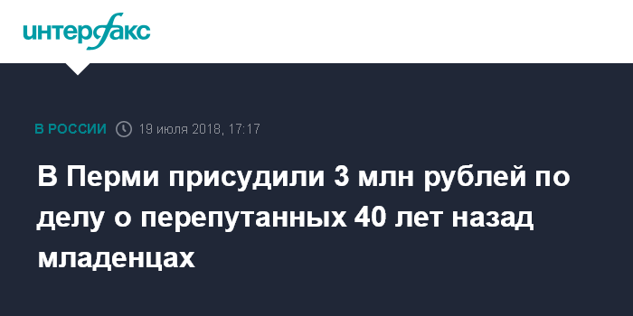 Москва. 19 июля. INTERFAX.RU - Ленинский районный суд Перми в четверг вынес решение по искам жительниц Пермского края, детей которых перепутали в родильном отделении больницы 40 лет назад.