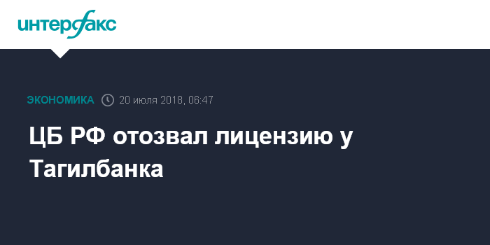 Москва. 20 июля. INTERFAX.RU - Банк России отозвал лицензию на осуществление банковских операций у Тагилбанка (Нижний Тагил, Свердловская область) говорится в сообщении ЦБ.