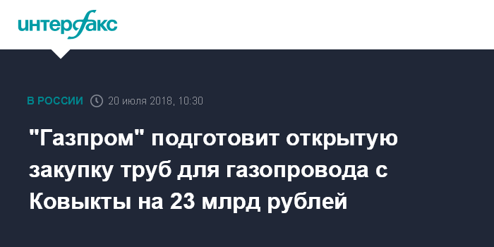 Москва. 20 июля. INTERFAX.RU - ПАО "Газпром" уже в августе планирует объявить 5 открытых запросов предложений на поставку труб большого диаметра (ТБД) для стройки "Магистральный газопровод "Сила Сибири" Участок "Ковыкта - Чаянда", сообщила монополия.