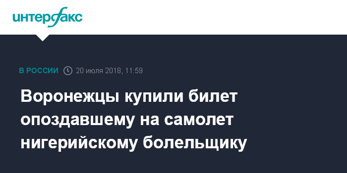 Москва. 20 июля. INTERFAX.RU - Сотрудники международного аэропорта "Воронеж" помогли болельщику сборной Нигерии, опоздавшему на свой рейс, сообщает пресс-служба аэропорта.