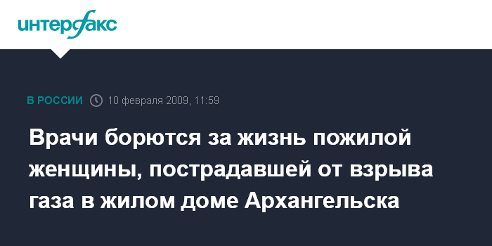 Москва. 10 февраля. INTERFAX.RU - Состояние 74-летней жительницы жилого дома, где утром взорвался газ, врачи оценивают как крайне тяжелое.