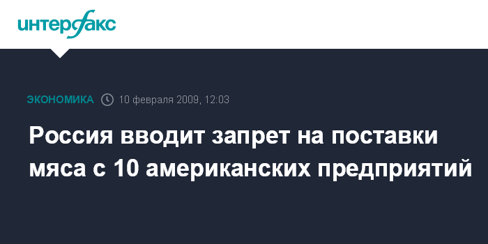 Москва. 10 февраля. INTERFAX.RU - Россия с 10 февраля запрещает поставки мяса с 10 предприятий США.
