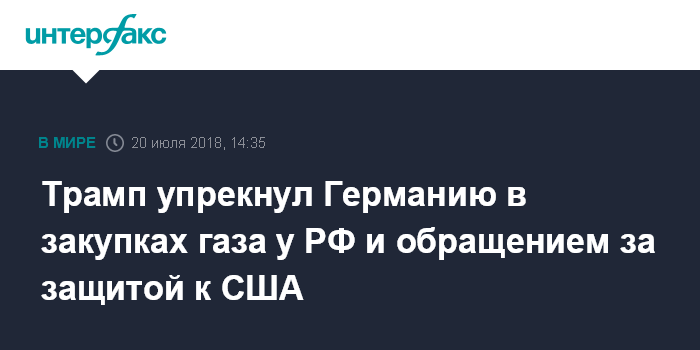 Москва. 20 июля. INTERFAX.RU - Президент США Дональд Трамп вновь обрушился с критикой на позицию Германии по проекту газопровода "Северный поток 2", заявив, что Берлин платит большие деньги за российский газ, но при этом просит США защиты от России.