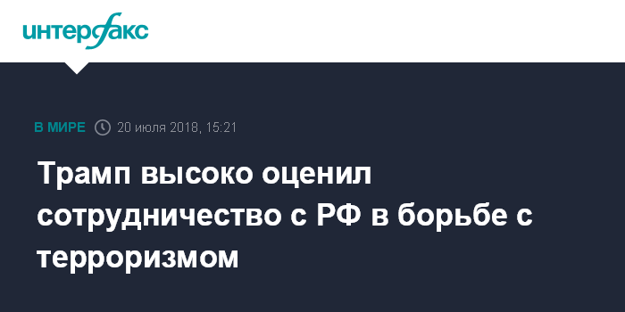 Москва. 20 июля. INTERFAX.RU - Президент США Дональд Трамп в пятницу дал положительную оценку сотрудничеству с Россией в том, что касается борьбы против терроризма.