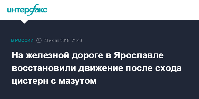 Москва. 20 июля. INTERFAX.RU - Железнодорожники восстановили движение пассажирских поездов на станции Полянки в Ярославле, где ранее произошел сход пяти цистерн с мазутом, сообщила пресс-служба Северной железной дороги.