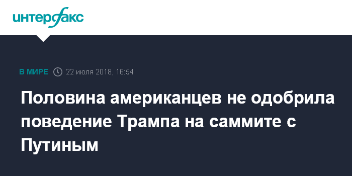 Москва. 22 июля. INTERFAX.RU - Только 33% опрошенных американцев одобрительно восприняли то, как себя вел президент США Дональд Трамп на встрече с президентом России Владимиром Путиным в Хельсинки, в то время как 50% не одобрили, свидетельствуют данные опубликованного в воскресенье совместного опроса газеты The Washington Post и телеканала ABC.