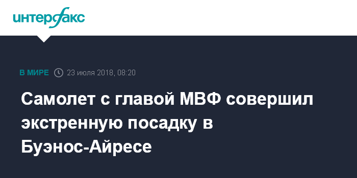 Москва. 23 июля. INTERFAX.RU - Экстренную посадку в столичном аэропорту Аргентины вскоре после взлета совершил самолет, на борту которого находилась глава Международного валютного фонда Кристин Лагард, сообщили аргентинские СМИ.