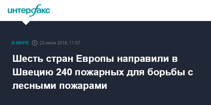 Москва. 23 июля. INTERFAX.RU - Европейские страны направили более 240 пожарных в Швецию, чтобы помочь местным экстренным службам в тушении лесных пожаров, охвативших ряд районов страны, передает в понедельник агентство Bloomberg.