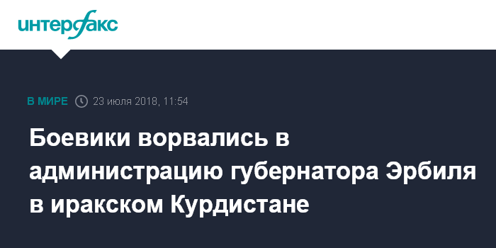 Москва. 23 июля. INTERFAX.RU - Группа боевиков в понедельник напала на администрацию губернатора Эрбиля в иракском Курдистане, сообщает курдский телеканал "Рудау".