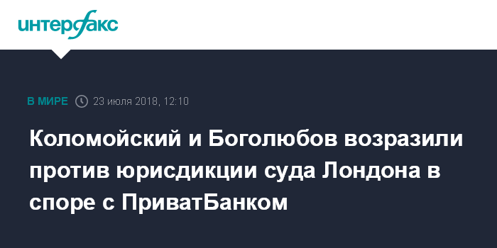 Москва. 23 июля. INTERFAX.RU - Игорь Коломойский и Геннадий Боголюбов оспаривают применимость юрисдикции Высокого суда Лондона при рассмотрении иска ПриватБанка (Киев), поданного декабре 2017 года, сообщил агентству "Интерфакс" осведомленный источник.