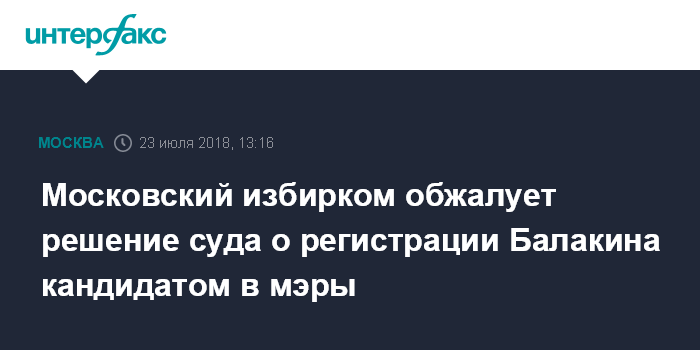 Москва. 23 июля. INTERFAX.RU - Мосгоризбирком (МГИК) обжалует в Верховном суде решение Московского городского суда, обязывающее комиссию зарегистрировать экс-владельца строительной компании СУ-155 Михаила Балакина кандидатом в мэры Москвы, выдвинутым партией "Союз горожан".
