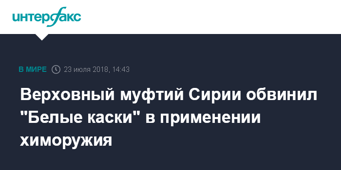 Москва. 23 июля. INTERFAX.RU - Верховный муфтий Сирии Бадреддин Хассун призвал привлечь членов организации "Белые каски" к ответственности за военные преступления против сирийского народа.