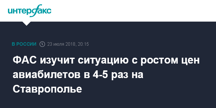 Москва. 23 июля. INTERFAX.RU - Власти Ставропольского края обратились в ФАС с просьбой изучить ситуацию со значительным с начала года ростом цен на авиабилеты из аэропортов региона, сообщил глава краевого Минэкономразвития Валерий Сизов.