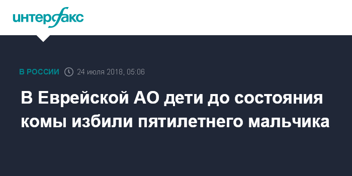 В правительстве Еврейской АО версию о нападении животного не подтвердили. По их данным, мальчика избили во дворе. "В совершении этого чрезвычайного происшествии подозреваем 10-летнего мальчика и 5-летнюю девочку. Сегодня комиссия по делам несовершеннолетних посетит их семьи, выяснит обстоятельства происшествия, пообщается с родителями", - сказала агентству уполномоченный по правам ребенка в Еврейской автономной области Ирина Пинчук.