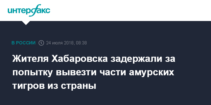 Москва. 24 июля. INTERFAX.RU - Сотрудники пограничного управления ФСБ по Хабаровскому краю изъяли у жителя Хабаровска части трех особей краснокнижного амурского тигра, сообщает пресс-служба Пограничного управления ФСБ РФ по региону.