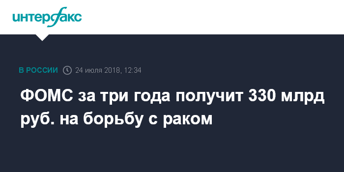 Москва. 24 июля. INTERFAX.RU - Фонду обязательного медицинского страхования (ФОМС) направят из федерального бюджета в 2019-2021 годы 330 млрд рублей на борьбу с онкозаболеваниями.