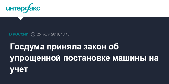 Москва. 25 июля. INTERFAX.RU - Госдума приняла в третьем окончательном чтении закон, упрощающий, как отмечают его авторы, регистрацию автомобилей и получение номерных знаков, предполагается, что новые машины не нужно будет ставить на учет через ГИБДД, автовладельцы смогут сделать у специальных организаций, в том числе автодилеров.