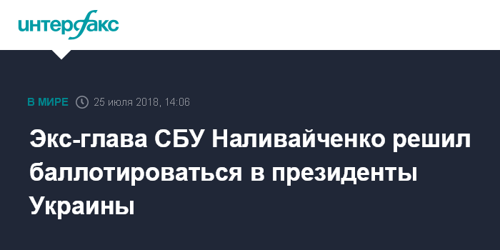 Москва. 25 июля. INTERFAX.RU - Лидер движения "Справедливость", экс-глава Службы безопасности Украины Валентин Наливайченко заявил о намерении участвовать в президентских выборах весной 2019 года.