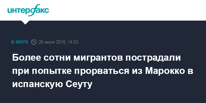 Москва. 26 июля. INTERFAX.RU - Почти 600 мигрантов в четверг попытались проникнуть в испанский анклав Сеуту с территории Марокко, сообщает Испанский Красный крест.