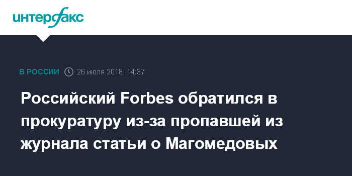 Москва. 26 июля. INTERFAX.RU - Редакция российского издания Forbes направила заявление в прокуратуру Москвы из-за пропажи текста о бизнесе братьев Зиявудина и Магомеда Магомедовых из отпечатанного августовского номера журнала, пишет в четверг газета "Ведомости".